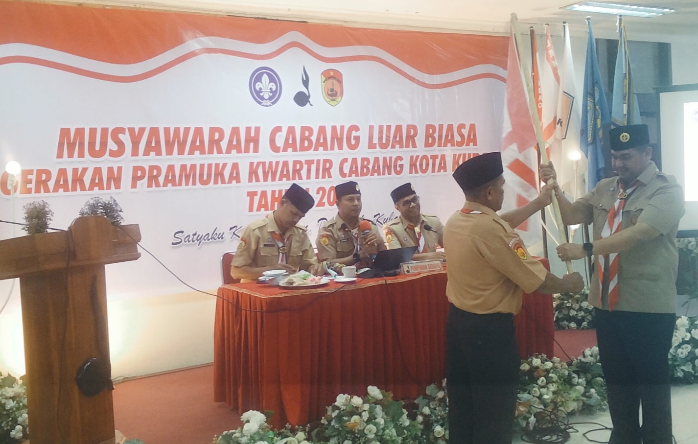 Andri Otta (kanan) menerima Pataka dari karateker ketua kwarcab Pramuka Kota Kupang, Senin (29/12) di gedung Kwarda Pramuka NTT