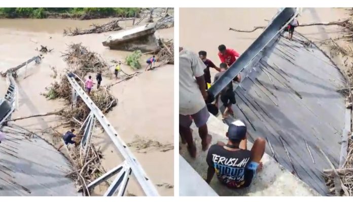 Dalam vidio pendek itu warga dengan beban dipundak menyebrangi sungai itu dengan menapaki puing-puing badan jembatan yang muncul di permukaan air.