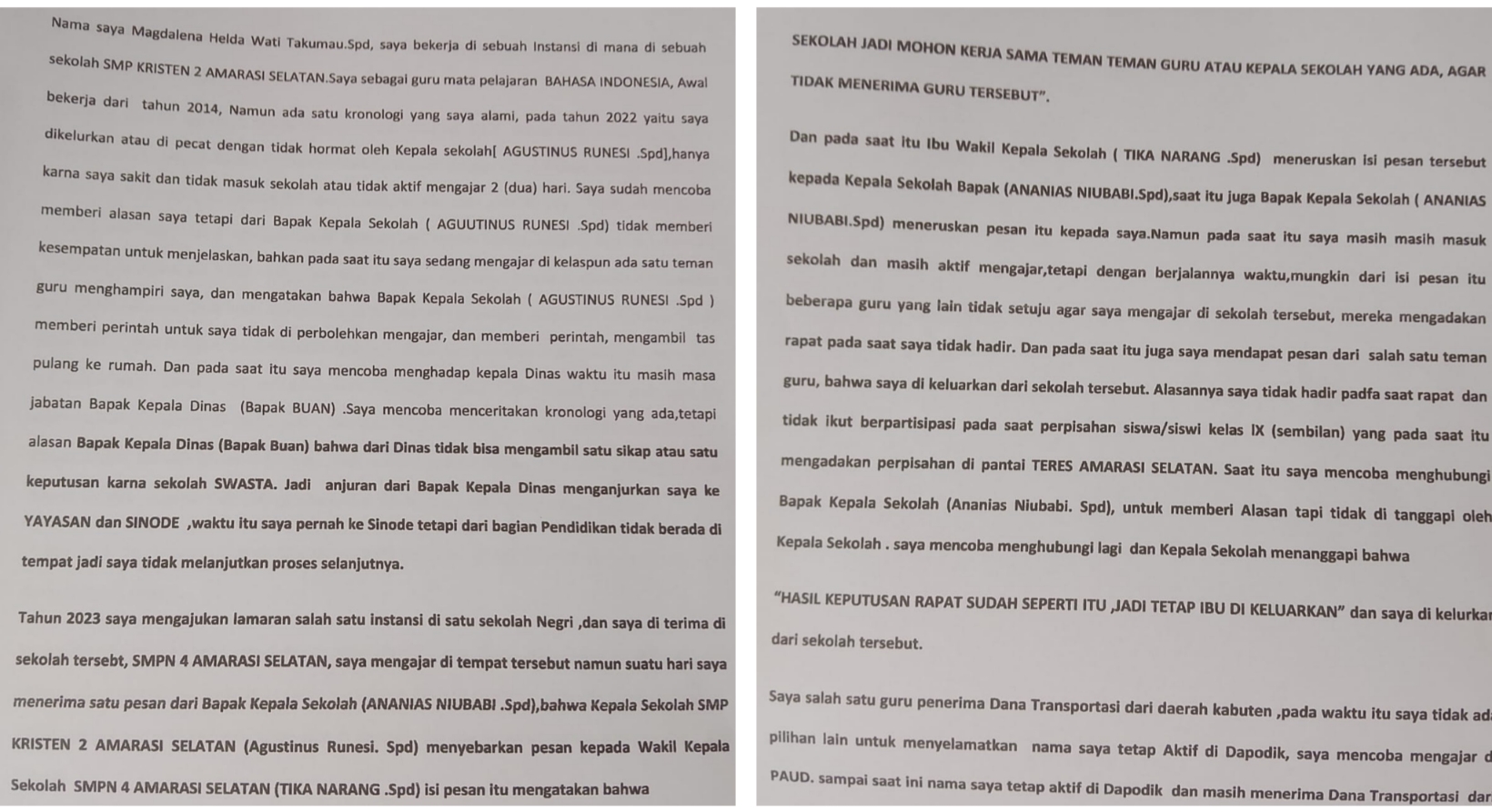 Dalam suratnya kepada dinas Pendidikan kabupaten Kupang yang diterima timurtoday.id, Rabu (9/10) Magdalena mengungkap kisah pilu yang dialami, dipecat sepihak oleh kepala sekolah.