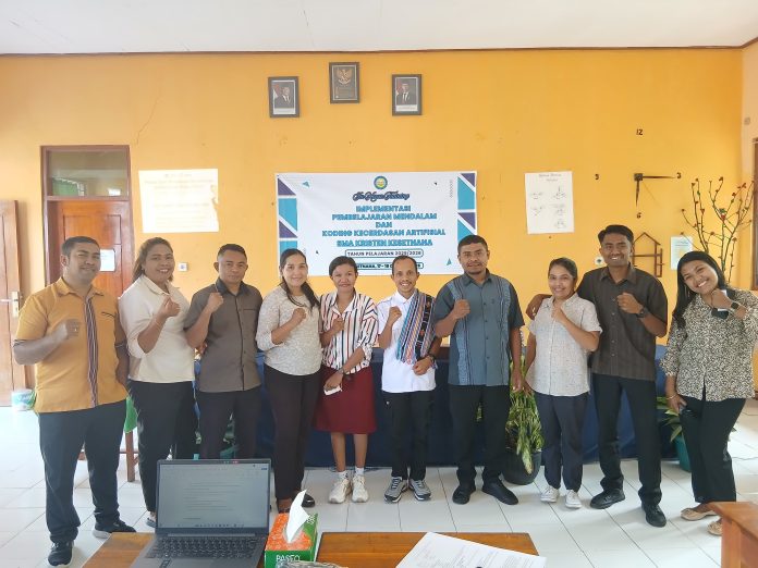 SoE, TiTo – Rhey Natonis, Pimpinan Redaksi MataTimor.com, berbagi materi Koding dan Kecerdasan Artifisial (KKA) pada hari kedua kegiatan In House Training (IHT) di SMA Kristen Kesetnana, pada 18 Oktober 2025.
